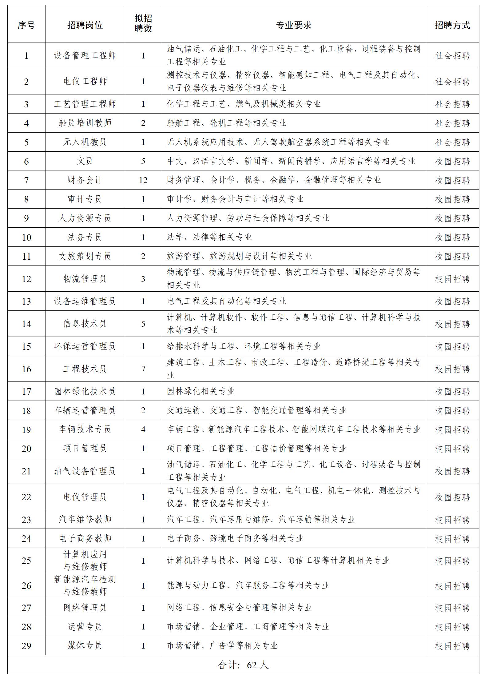 2.船员培训教师及无人机教员岗位应聘者应具备普通高等院校大专及以上学历和相应学位,其他岗位应聘者应具备普通高等院校本科及以上学历和相应学位,且专业与岗位需求相匹配;