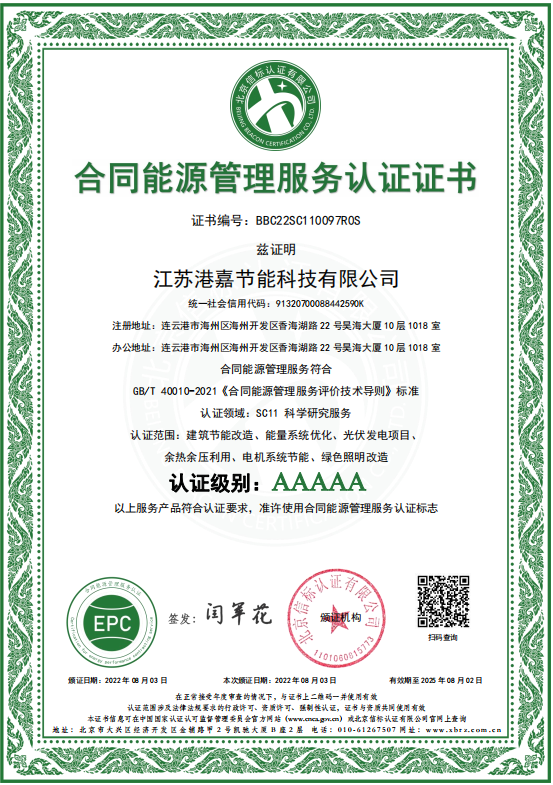 港嘉公司作为以合同能源管理模式进行专业节能服务公司,具有丰富的项目实施经验,此次获得最高AAAAA等级认证,标志着将为客户提供卓越的合同能源管理服务,以灵活多样的服务模式为客户量身定制和实施智慧节能解决方案,助力绿色节能