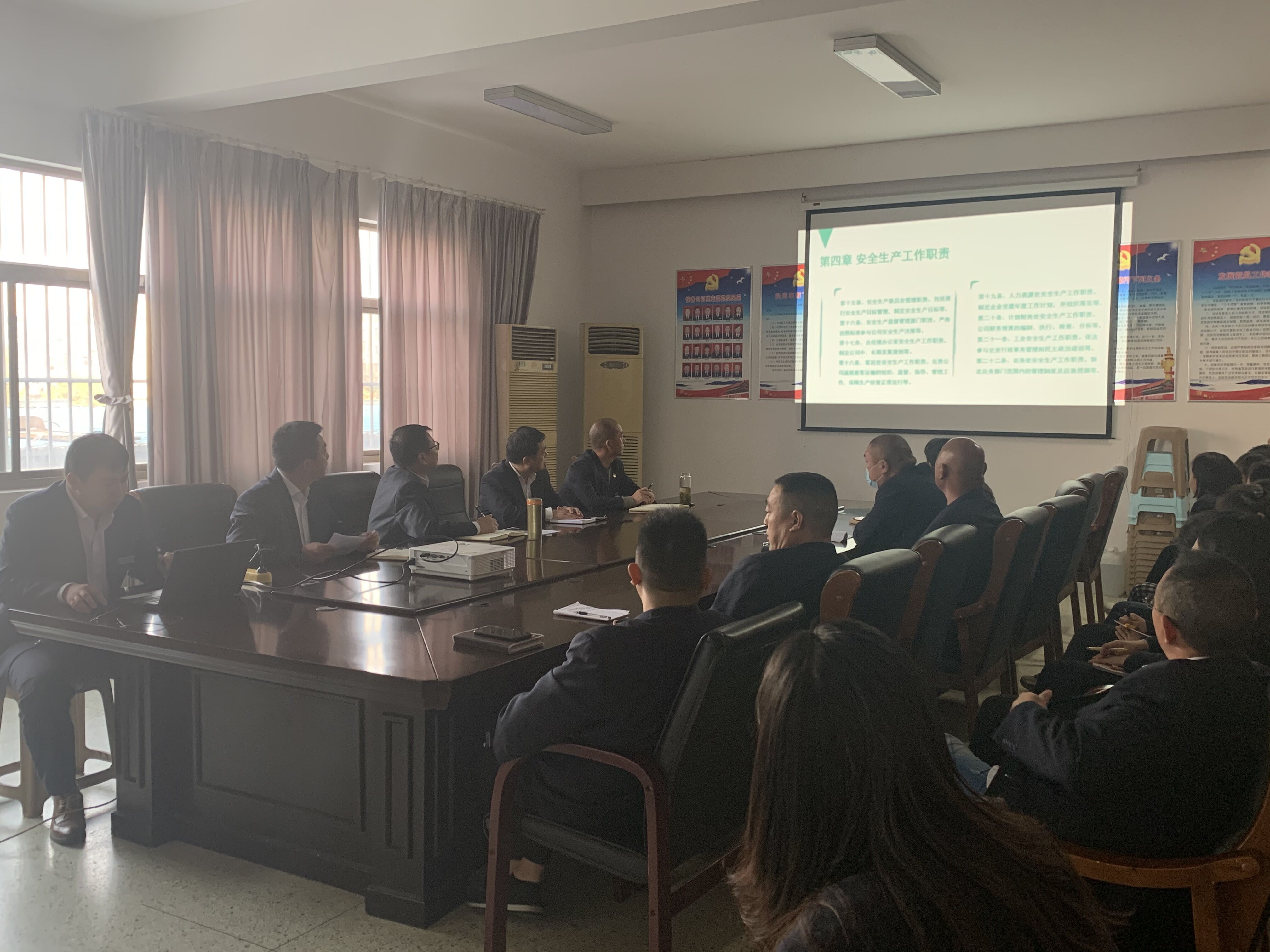 在现场培训会上,梁培刚首先对此次培训的目的进行了说明,接着以PPT投影的方式紧紧围绕安全生产责任制制度、安全生产追究办法、安全生产考核奖惩办法、专职安全生产管理人员奖惩考核办法、安全生产责任制落实分级化管理等十个方面对全员开展培训。