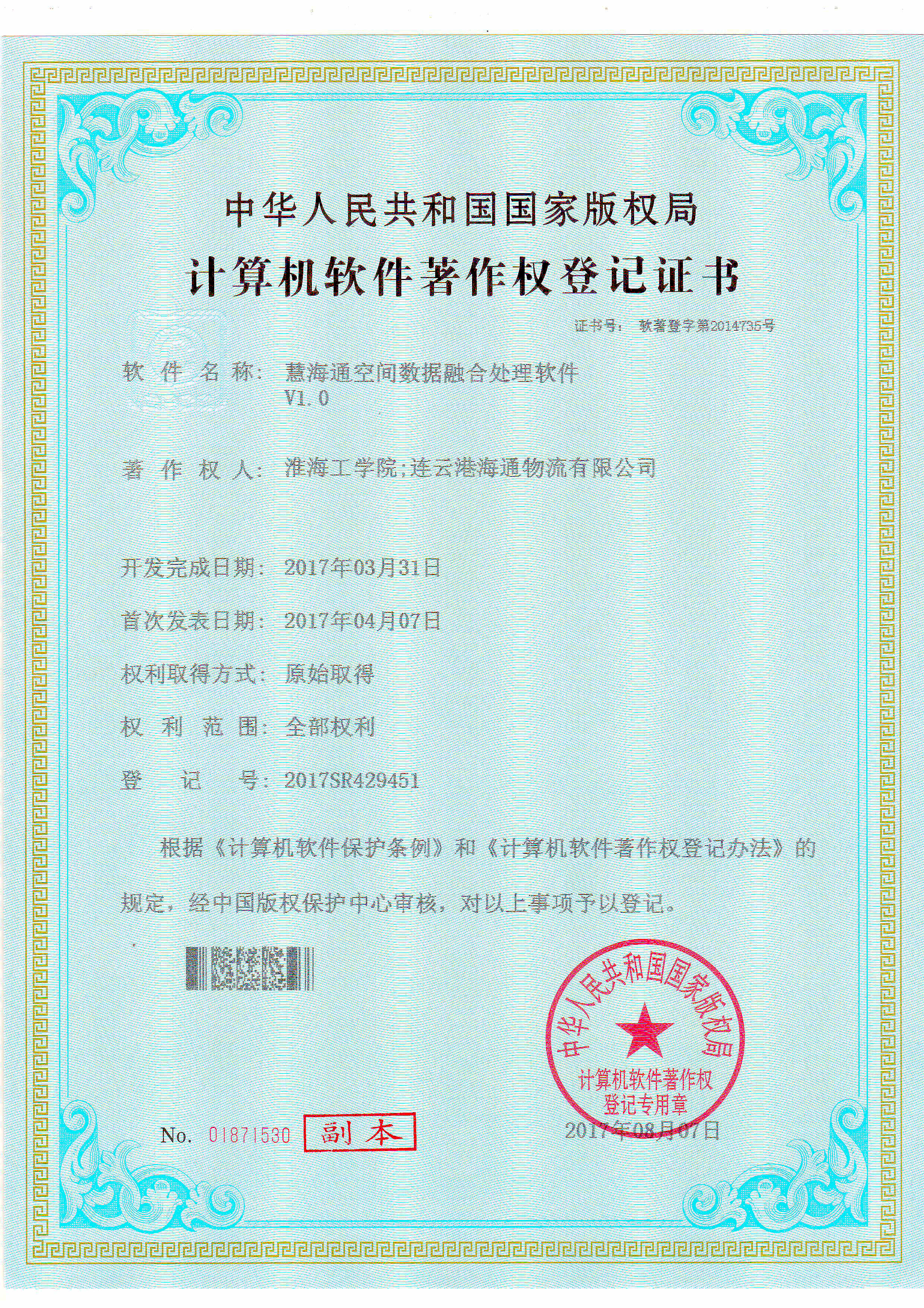 8月28日,经国家版权局审核,连云港海通物流有限公司与淮海工学院合作申请的《汇海通空间数据融合处理软件V1.0》、《汇海通物流园物业管理GIS系统软件V1.0》符合《计算机软件保护条例》和《计算机软件著作权登记办法》的相关规定,被认定为原始取得,并获得国家版权局颁发的《计算机软件著作权登记证书》。标志着物流公司在信息系统中形成持续创新机制,保护公司自主知识产权,更对内外支持服务水平和公司核心竞争力提升起到推动作用。