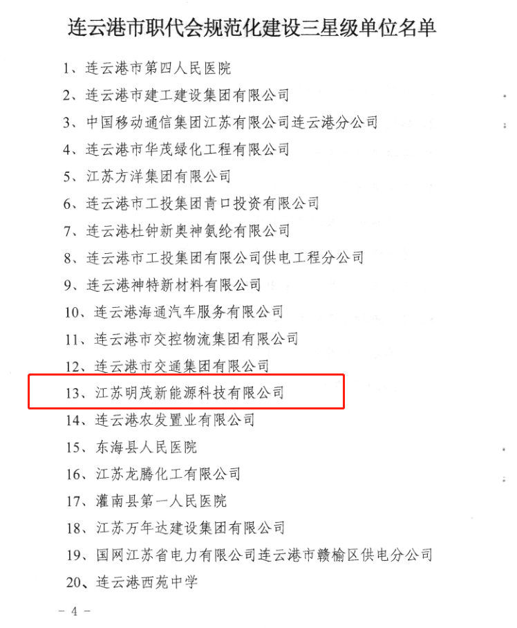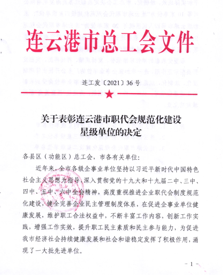 近日,经市总工会验收、明茂公司被授予“连云港市职工代表大会规范化建设三星级单位