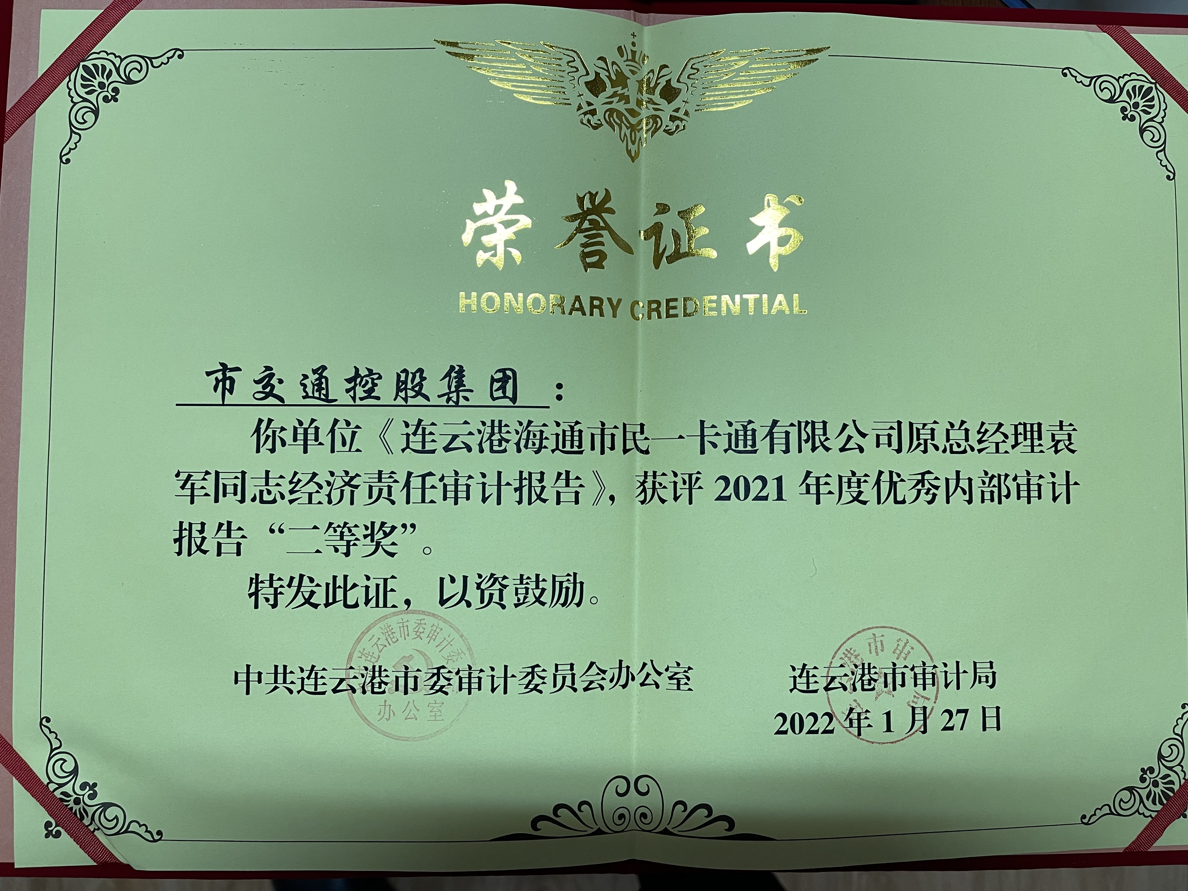 近日,赢博app最新版下载,赢博(中国)审计部出具的审计报告——《连云港海通市民一卡通有限公司原总经理袁军同志经济责任审计报告》,在审计局组织有关人员对2021年度全市内部审计报告开展评选工作中获得连云港市委审计委员会和连云港市审计局共同颁发的2021年度优秀内部审计报告“二等奖”。
