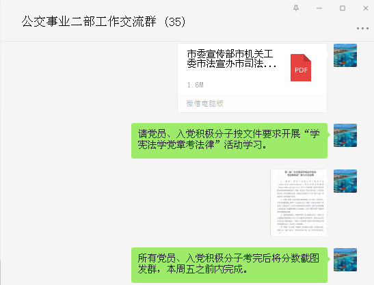 为切实组织开展好此次考法活动,公司高度重视,一是在党建工作微信交流群传达文件精神,要求党员干部应带头尊法、学法、守法、用法,提高法治素养。二是让部分党员利用工作之余先学习,先完成考试,营造学法氛围,以便带动全体党员、入党积极分子参与此次活动。三是针对部分年龄较大的驾驶员党员,综合办公室安排专人对接辅导,为他们发放题库,教他们如何进入考试系统,如何答题等等,确保学法考试顺利完成。