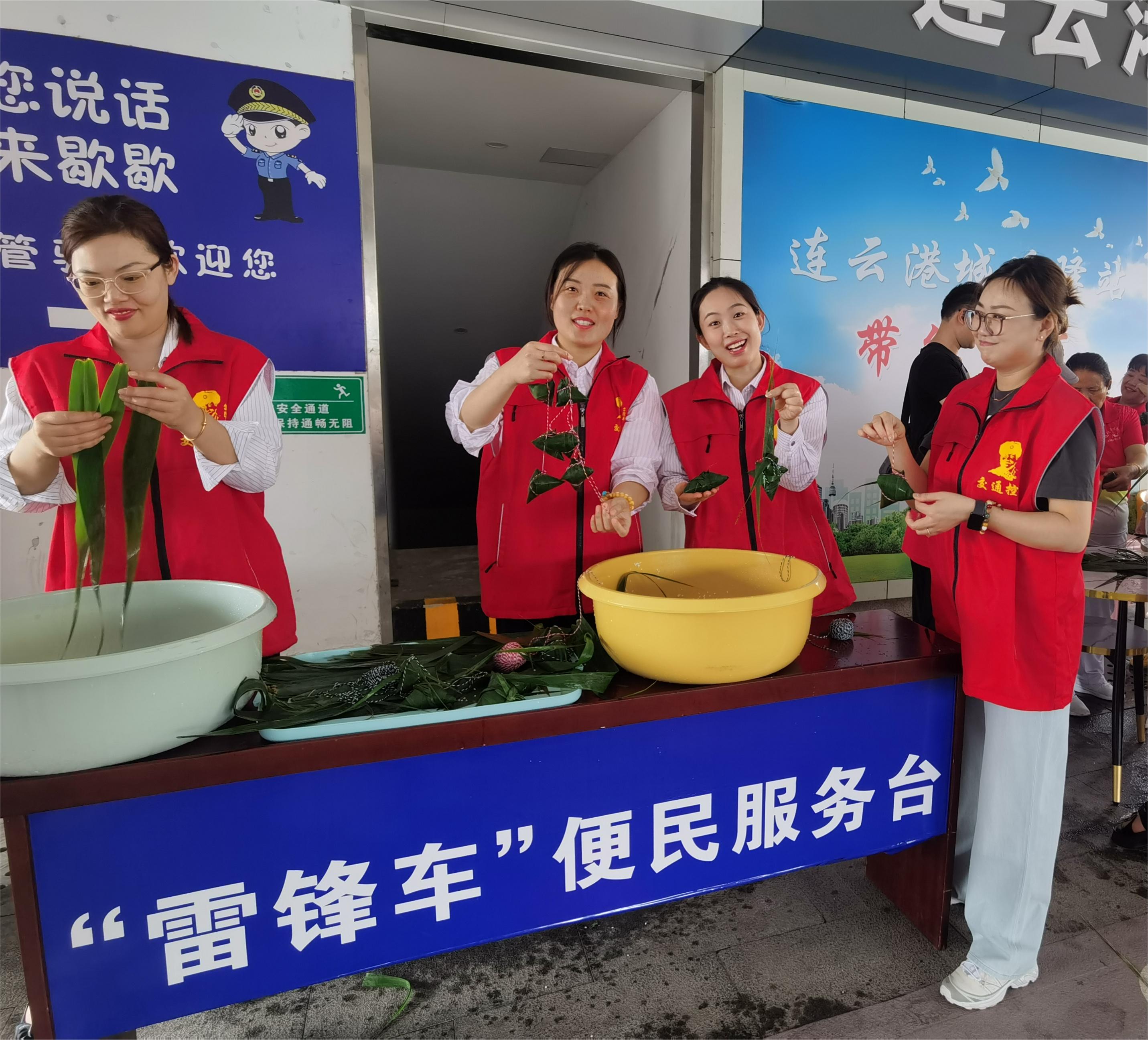 “雷锋车”手们带着粽子和香囊在连云港市高铁站的“雷锋车”驿站前,为南来北往的旅客送上节日祝福。每个收到粽子和香囊的旅客都露出了灿烂笑容。来连云港市旅游的张大爷接过粽子连声称赞:我带小孙子第一次到连云港市来旅游就遇到你们的端午节活动,让我在旅途中就吃到了端午节的第一个粽子,太开心了!”。