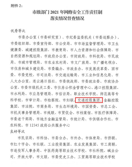 日前,市网信办通报2021年度全市党委(党组)网络安全工作责任制落实情况督查检查结果,赢博app最新版下载,赢博(中国)被评为优秀等次。