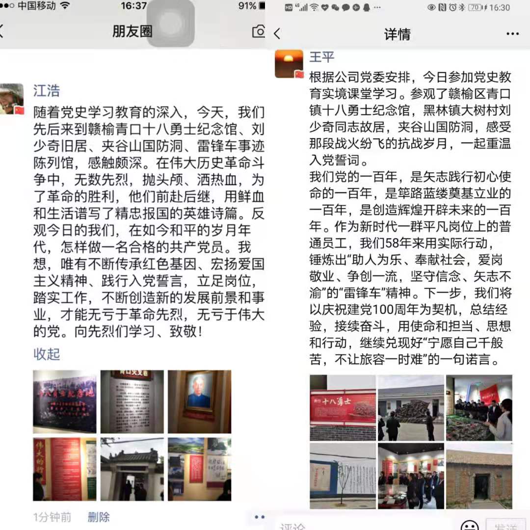 活动结束后,党员们在微信平台分享了党史学习微感悟。大家纷纷表示,作为一名共产党员,我们要对照学史明理、学史增信、学史崇德、学史力行的要求,向十八勇士等革命先烈学习,继承革命优良传统,集聚精神力量,守初心担使命抓落实,以更加昂扬的精神状态,过硬的工作作风,投入到公司的高质发展中来。