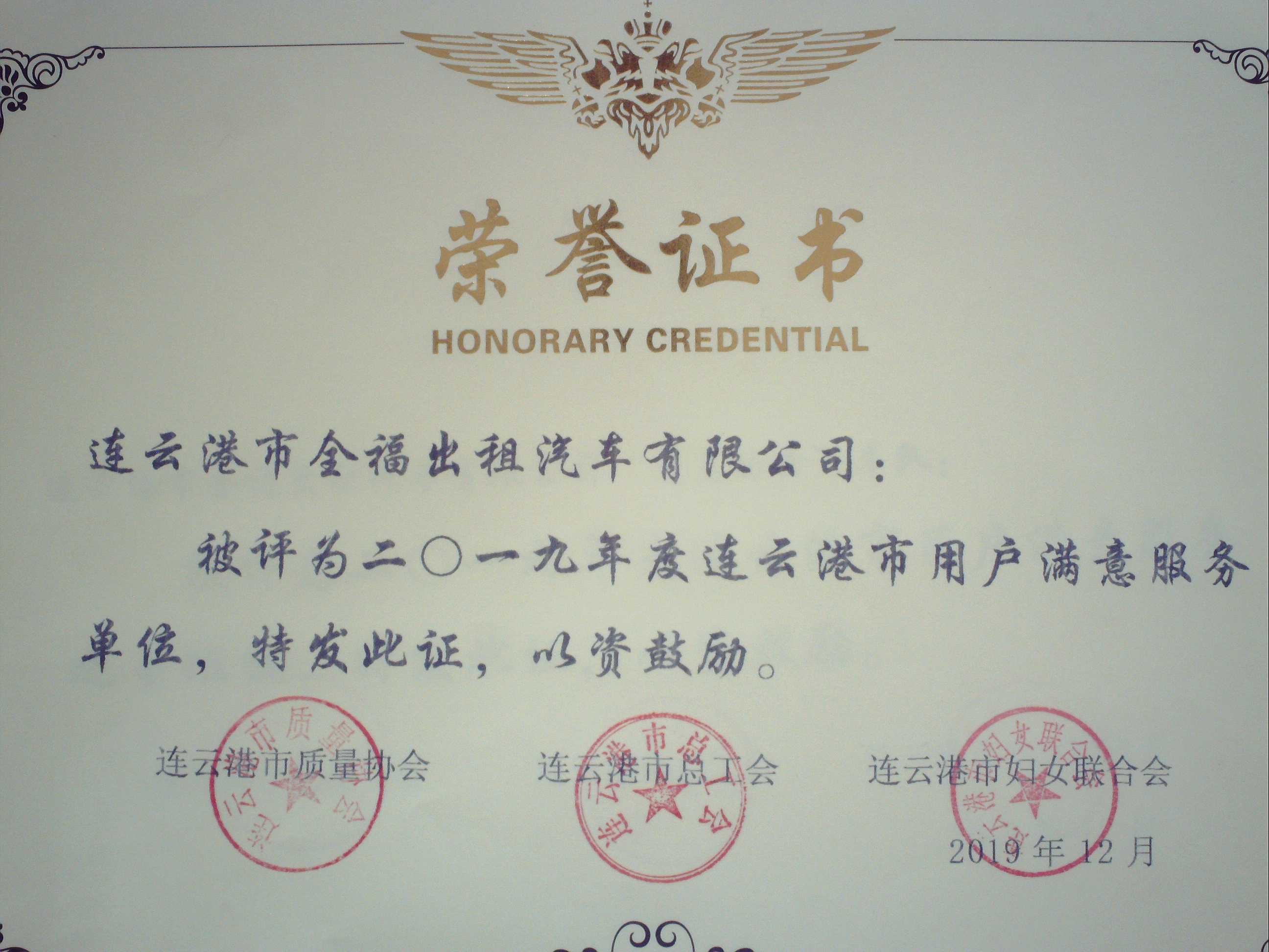 1月16日上午,汽服公司出租汽车事业部全福公司工作人员从连云港市经信委领取了连质协[2019]24号《关于表彰2019年度“连云港市用户满意服务之星”创建活动先进集体和个人的决定》文件、证件及奖牌,公司荣获