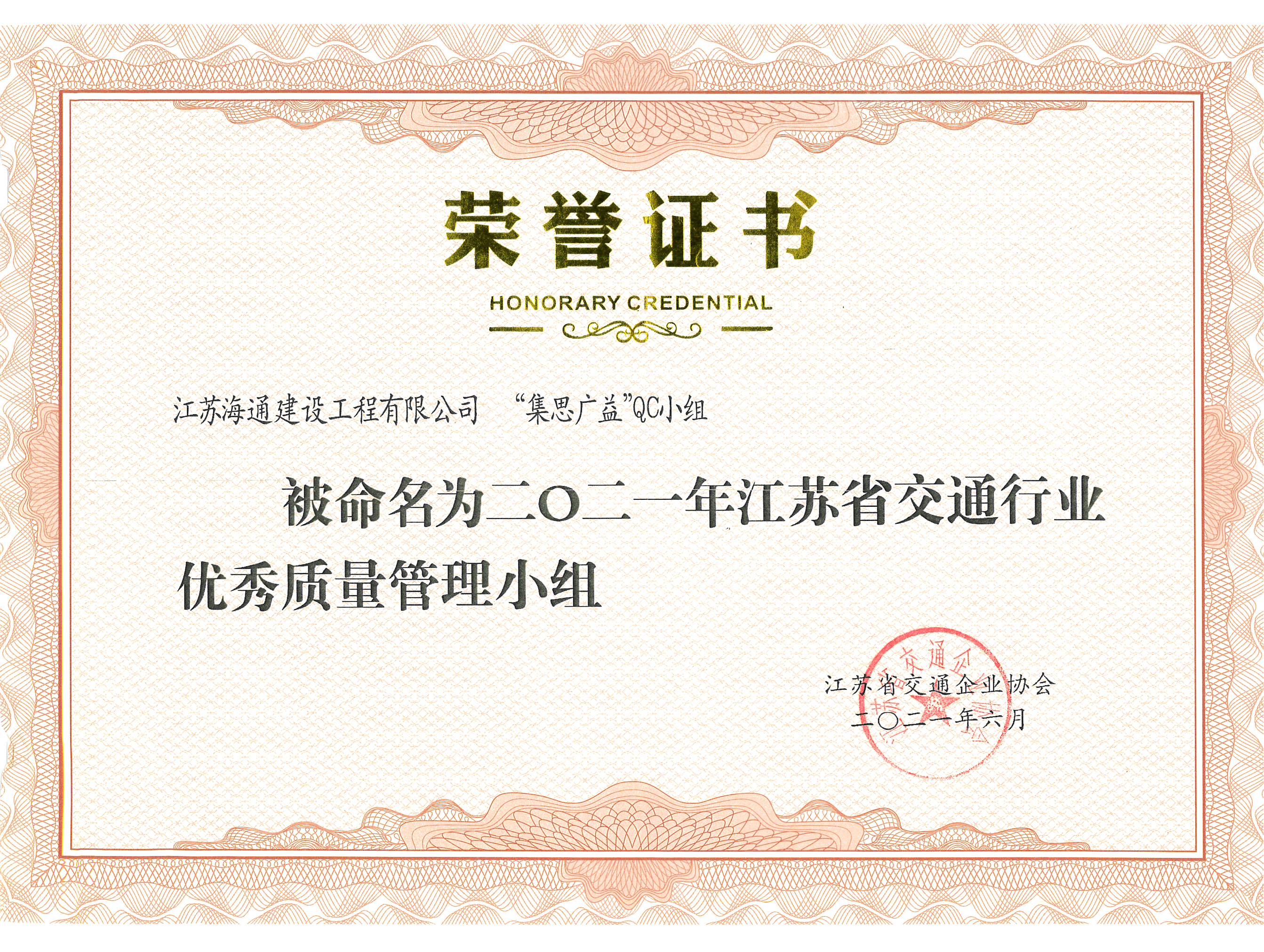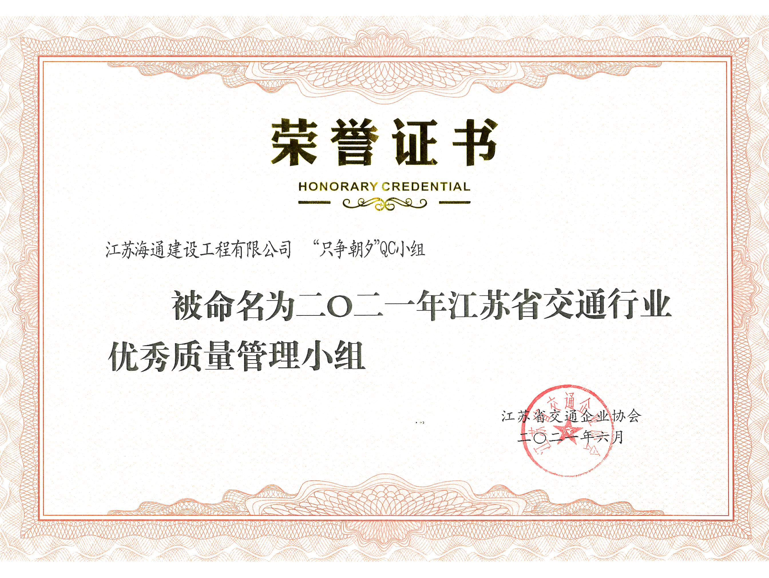 近日,江苏省交通企业协会公布了《关于公布2021年度江苏省交通行业优秀质量管理小组评选结果的通知》、《关于公布江苏省交通运输行业2021年度优秀QC小组活动成果获奖名单的通知》,江苏海建公司只争朝夕QC小组被评为2021年度江苏省交通行业优秀质量管理小组,集思广益QC小组及成果《提高波形梁护栏安装合格率》被评为2021年度江苏省交通行业优秀质量管理小组、2021年度优秀QC小组活动成果三等奖。