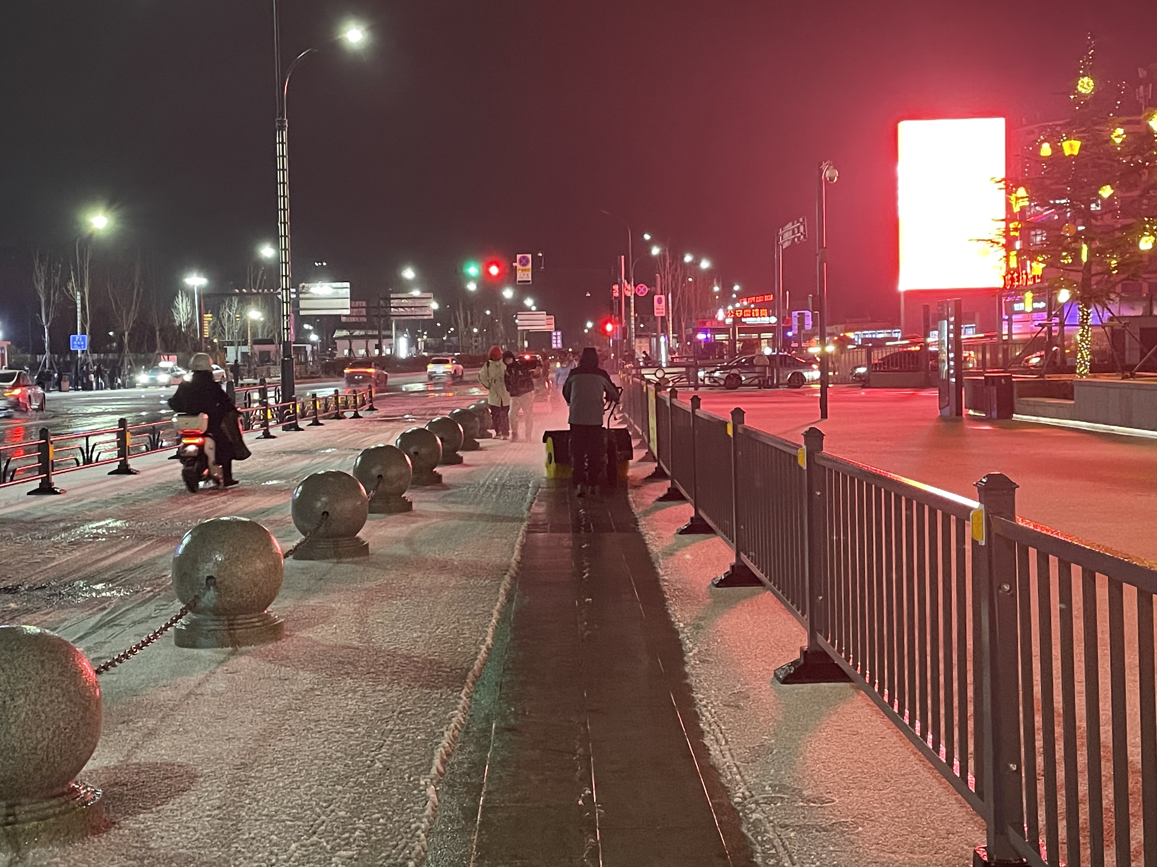 截止21日上午8点,共出动了撒布一体机15台,铲雪车9台,其他机械设备19台套,人员200人次,撒布融雪剂600余吨。