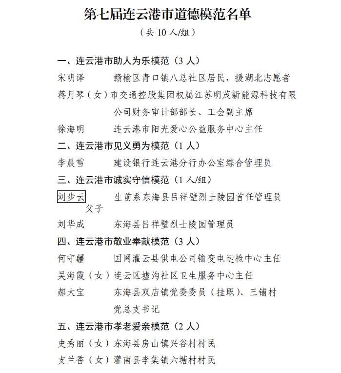蒋月琴同志现为明茂公司财务部长、工会副主席。平时她不仅工作认真负责,而且乐于助人。她在近10年来组织向贫困山区捐送冬衣4000余件,并坚持20余年无偿献血,从200毫升到300毫升再到400毫升,这些年她累计献全血6600多毫升、血小板1000毫升。在今年的疫情防控中,她主动捐款捐物,并组织单位女职工奔赴防疫一线值守。她先后被评为港城“叶欣仁”、市“三八红旗手”、海州区“爱心市民”。日前,连云港市精神文明建设指导委员会下发《关于表彰第七届连云港市道德模范的决定》(连文明委〔2020〕14 号 ),蒋月琴获连云港市助人为乐模范称号。