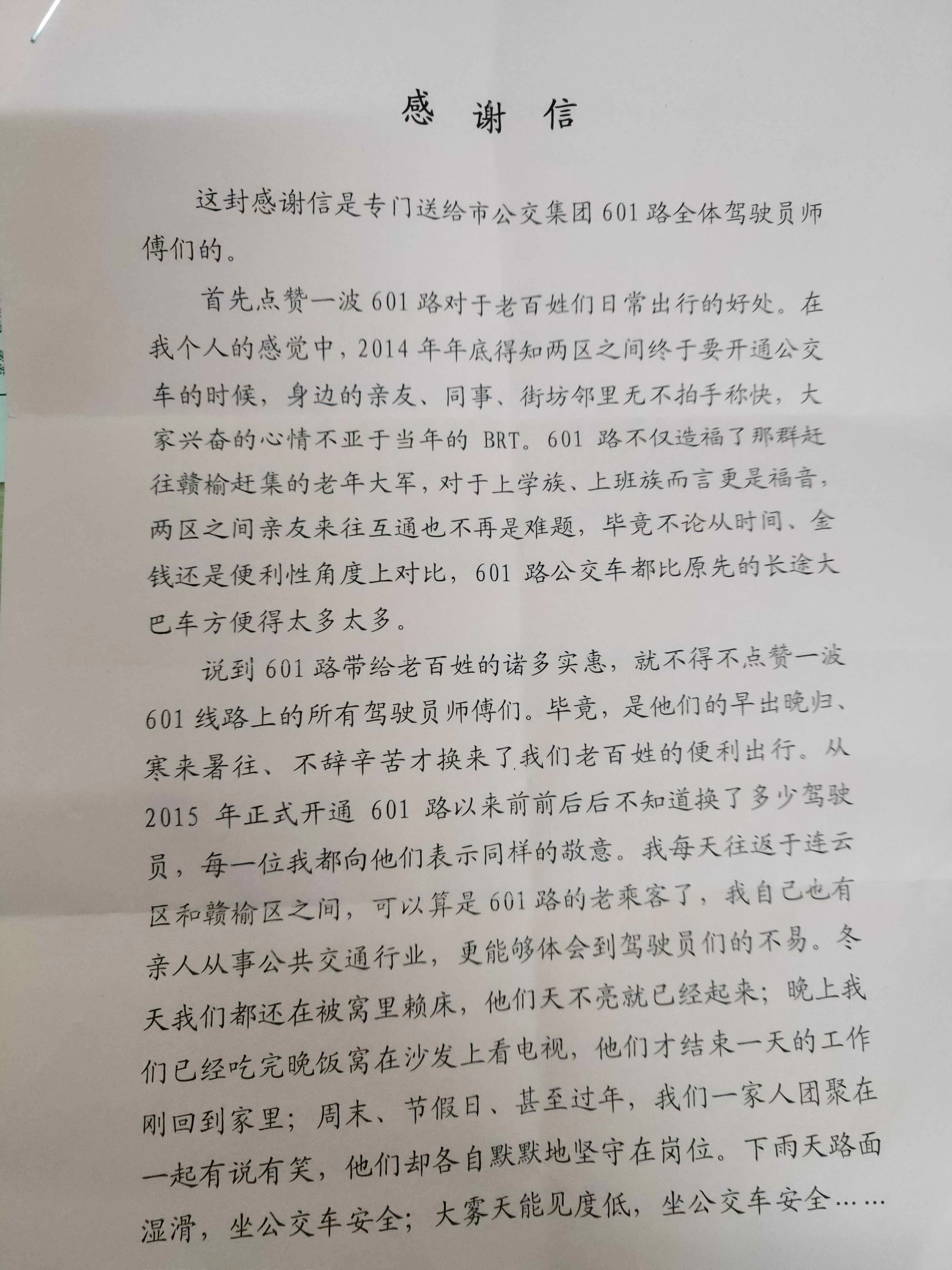 感谢信中提到:601路带给老百姓的诸多实惠当中,作者最要感谢的就是601全线上的所有驾驶员师傅们。是他们的早出晚归、寒来暑往、不辞辛苦才换来了老百姓的便利出行。从2015年正式开通601路以来,每一位驾驶员都是兢兢业业地奋斗在工作岗位上,披星而出,戴月而归,甚至于节假日都坚守在岗位上!乘客们再享受公交车带来的便利、舒适的同时,打从心底里感激这些任劳任怨的驾驶员们!