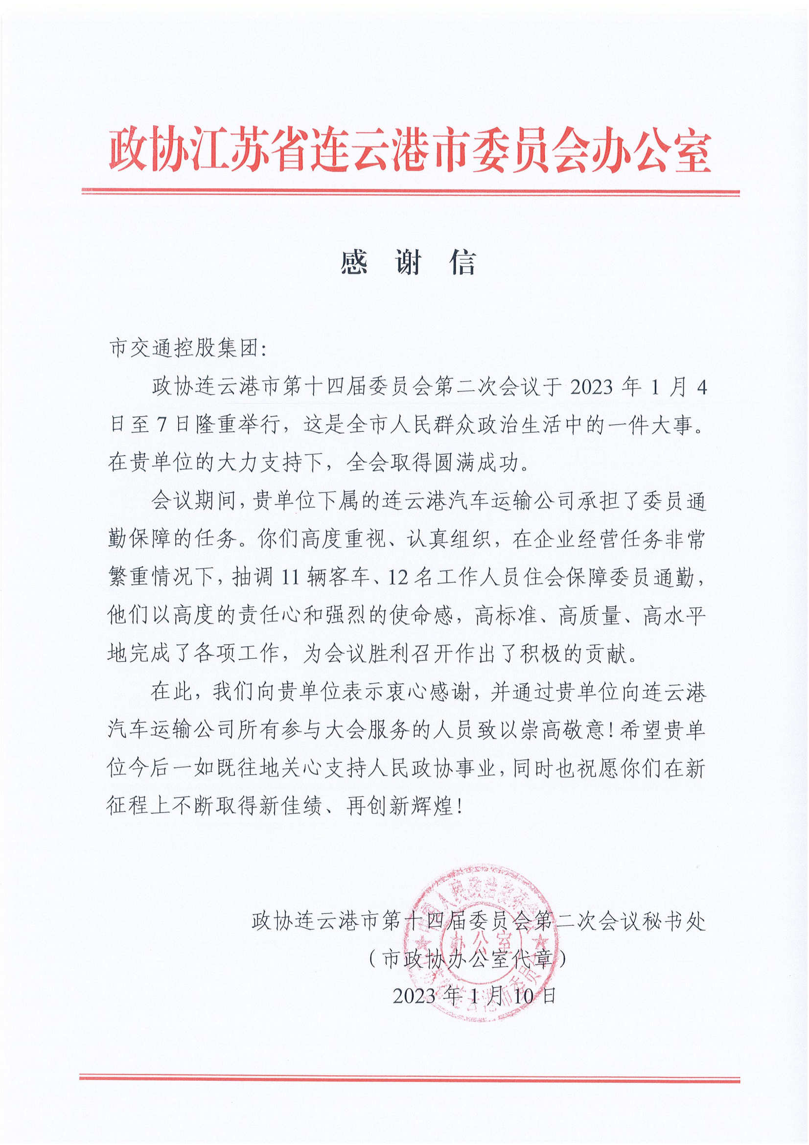 近日,从市交通控股赢博app最新版下载,赢博(中国)获悉,政协连云港市第十四届委员会第二次会议秘书处发来感谢信,对汽车公司在第十四届委员会第二次会议中的交通保障工作表示衷心感谢,对公司所有参与大会服务的人员致以崇高的敬意。