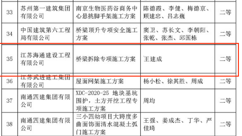 8月31日,从江苏省建筑行业协会工程建设质量与技术管理分会获悉,江苏海建公司申报的《桥梁拆除专项施工方案》荣获二等奖。本次评审中,全省共130项施工方案参评,海建公司排名第35名,获得二等奖。